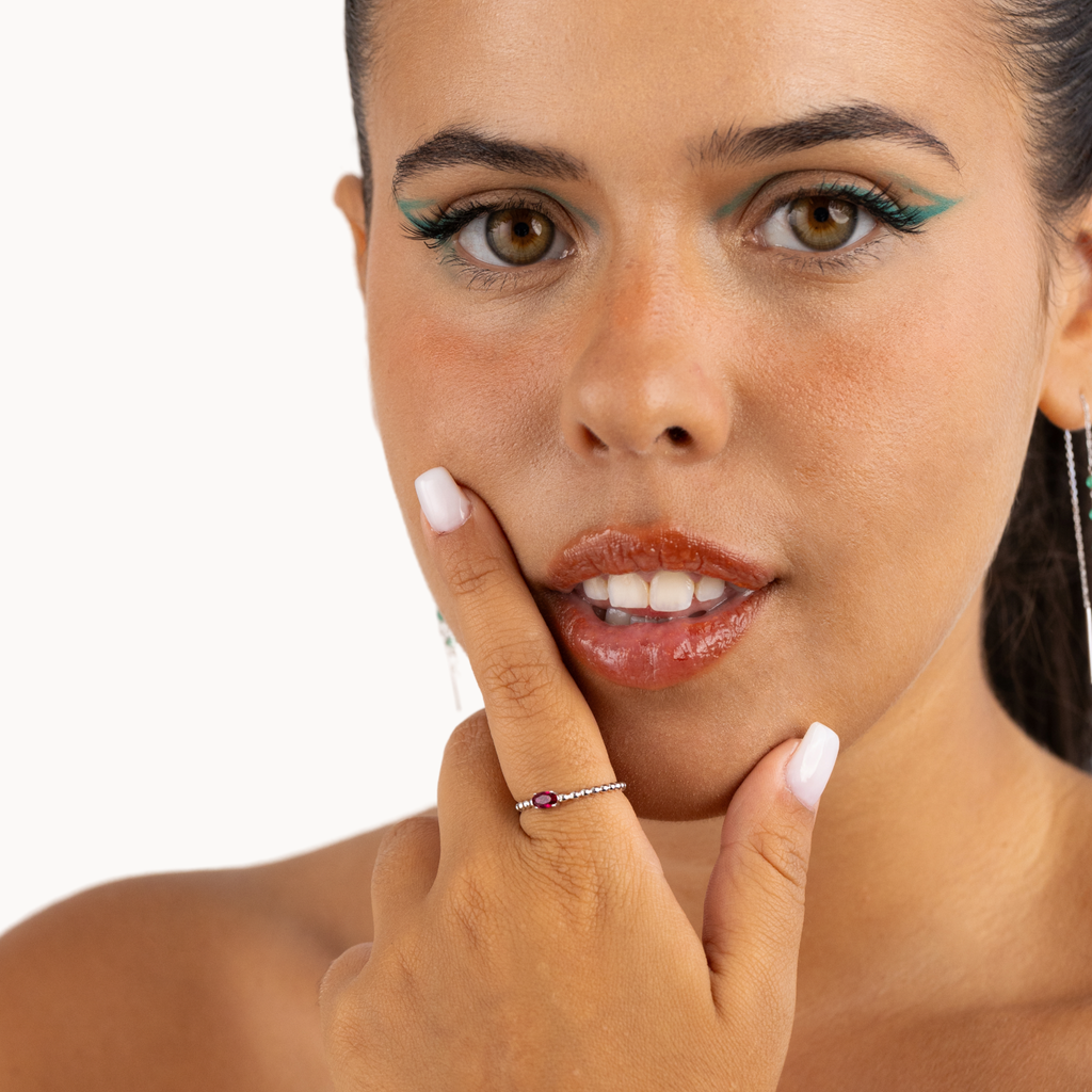 ‣ Anel Fragola é um anel cheio de personalidade, com pequenas esferas e destaque para uma Zircónia Vermelha. Podes combinar este modelo com outras peças para o mix and match perfeito.