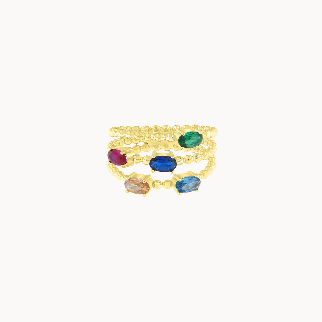 ‣ Anel Frutti é um multi anel com tiras cruzadas e cinco zircónias coloridas. Uma peça divertida e irreverente, ideal para marcar uma ocasião especial. Podes combinar este modelo com outras peças para o mix and match perfeito.