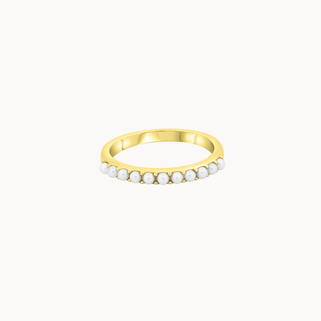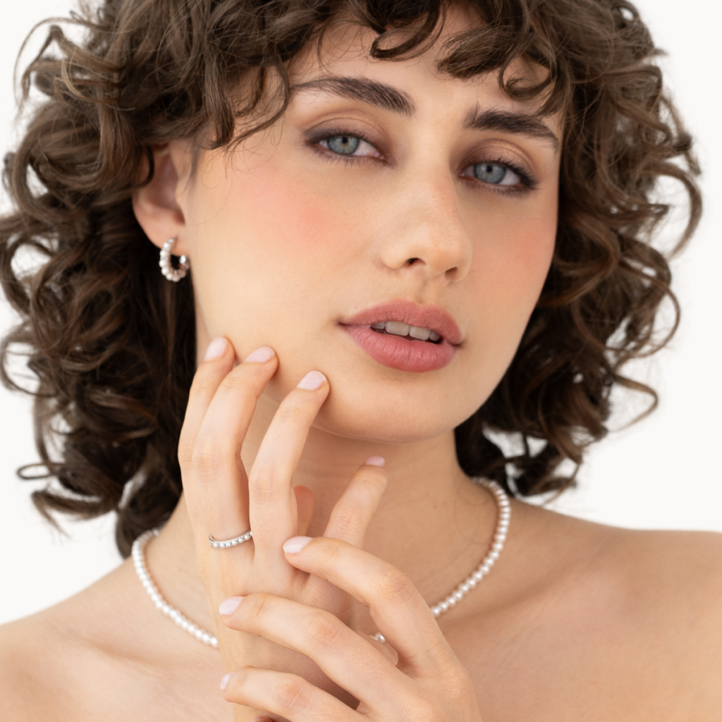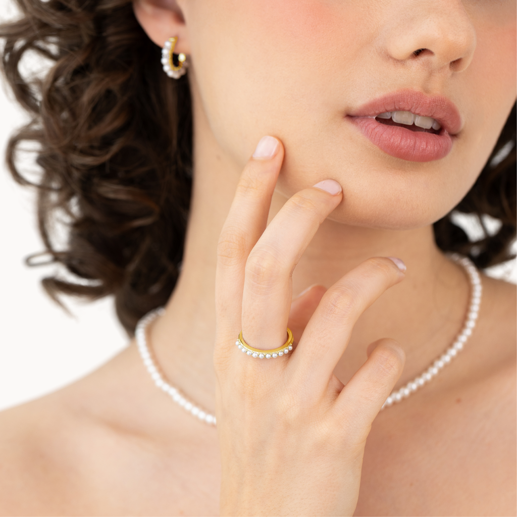 ‣ Anel Meera é uma aliança fina e elegante, com pequenas pérolas na parte superior. Uma peça discreta mas cheia de significado, ideal para ser combinada com outras peças da coleção Madre para o mix and match perfeito.