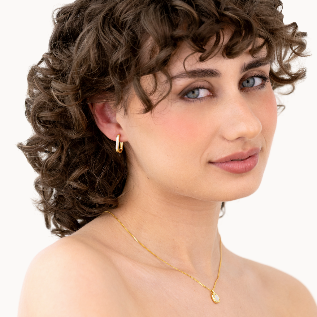 ‣ Argolas Elos Madre são um par de argolas com um design elegante e minimalista, em formato retangular. São marcadas por um delicado recorte central em madrepérola, que acrescenta um toque clássico e feminino. Apresentam um fecho click, garantindo praticidade e segurança na utilização. Podes combinar este modelo com outras peças da coleção Madre para o mix and match perfeito.