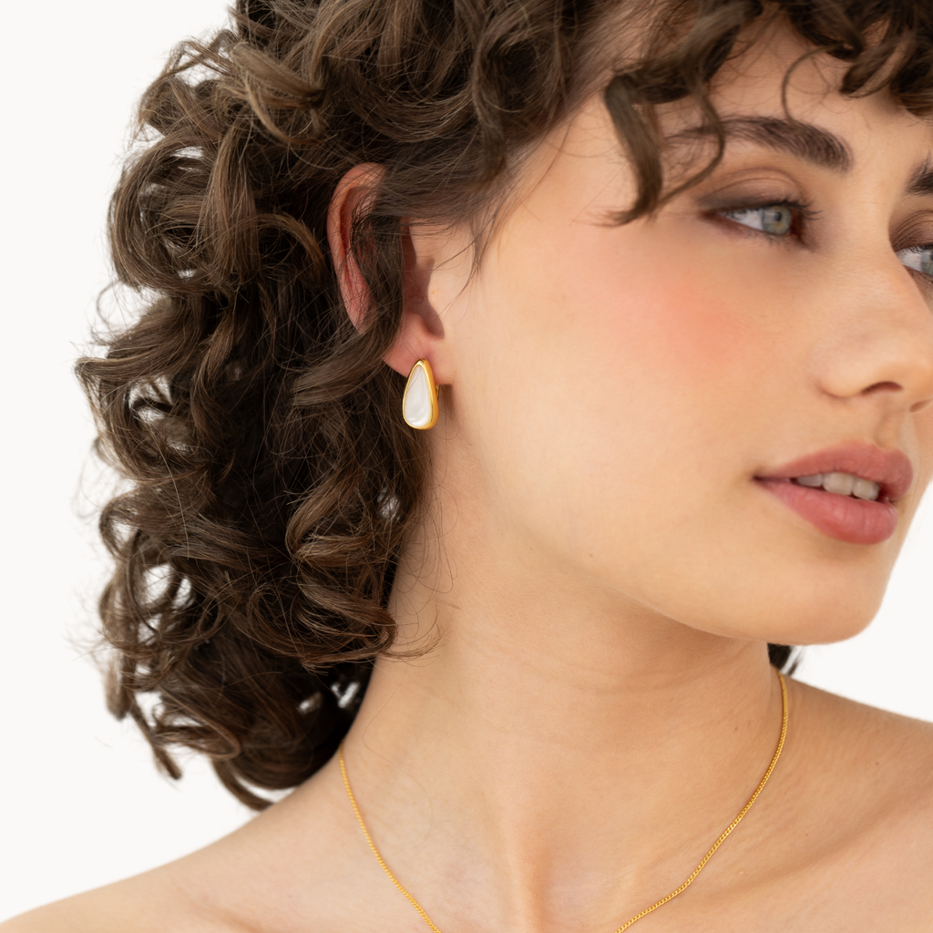 ‣Brincos Madre são um par de brincos em formato de gota, com madrepérola no centro. Com um design elegante e marcante, são ideais para dar um toque sofisticado a qualquer look. Apresentam um fecho click, garantindo praticidade e segurança na utilização. Podes combinar este modelo com outras peças da coleção Madre para o mix and match perfeito.