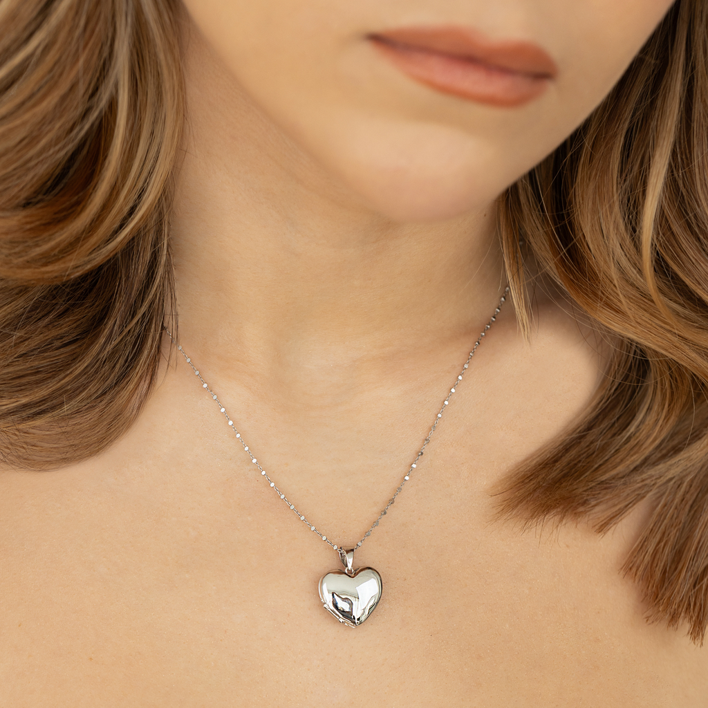 ‣ Colar Memória é um colar com uma malha delicada, tendo como destaque um pendente locket em formato de coração. O pendente abre e fecha, de forma a guardar uma pequena fotografia ou nota no interior. A peça pode ser personalizada na parte exterior e/ou interior, podendo escolher os detalhes da gravação: uma data especial, iniciais, nome - até 8 caracteres.