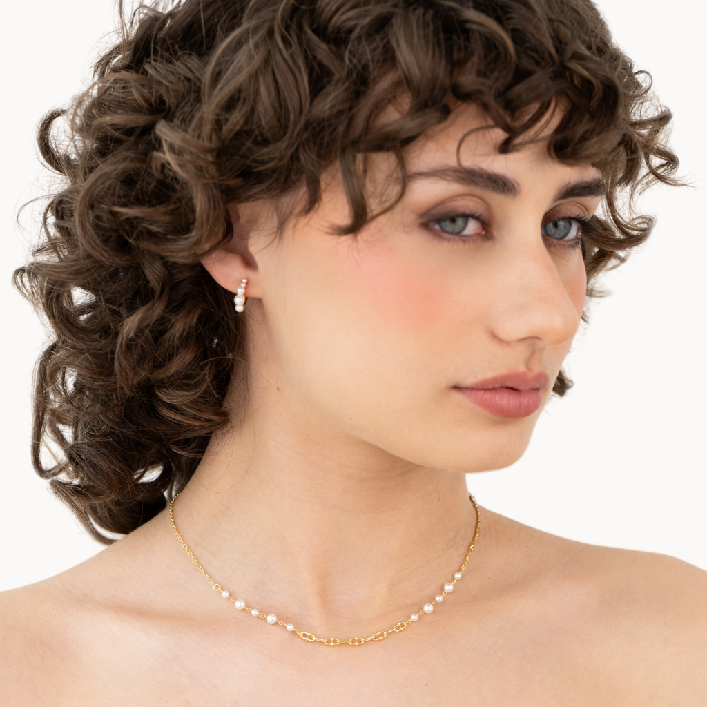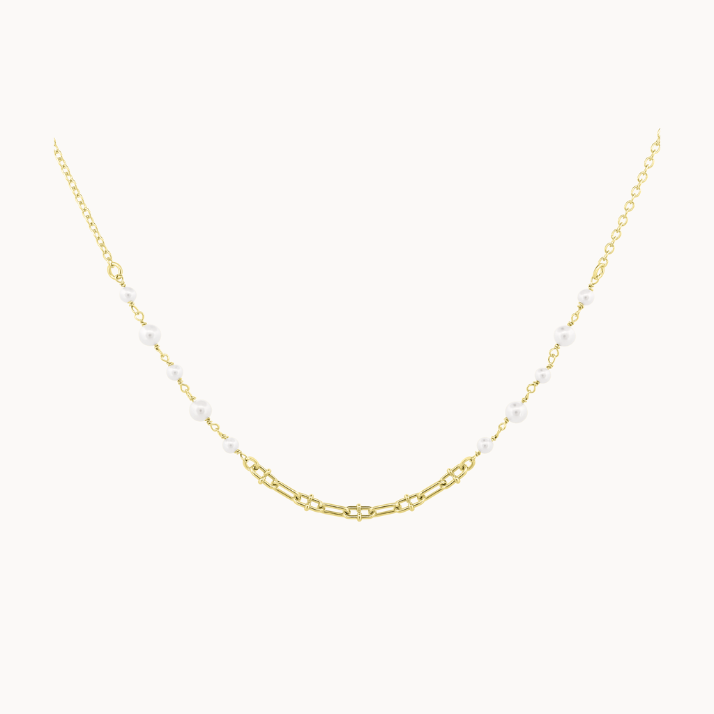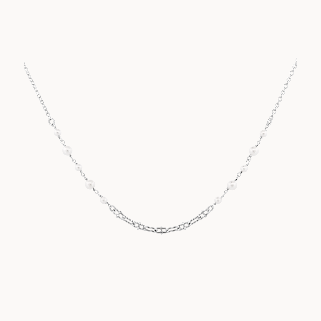 ‣ Colar Mère é um colar com uma malha delicada que combina pérolas assimétricas com elos finos, criando um contraste subtil entre o clássico e o contemporâneo. Uma peça versátil e feminina, perfeita para o dia-a-dia ou para ocasiões especiais. Podes combinar este modelo com outras peças da coleção Madre para o mix and match perfeito.