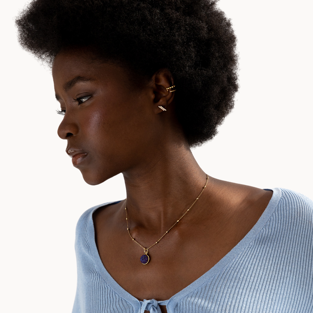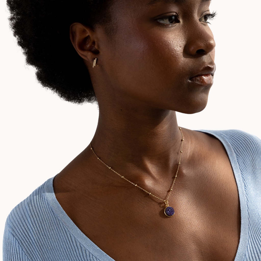 ‣ Colar Amethy Roxa é um colar com uma malha fina composta por pequenas bolas intercaladas e um pendente em formato redondo, adornado com uma pedra ametista de cor roxa. Podes combinar este modelo com outras peças para o mix and match perfeito.